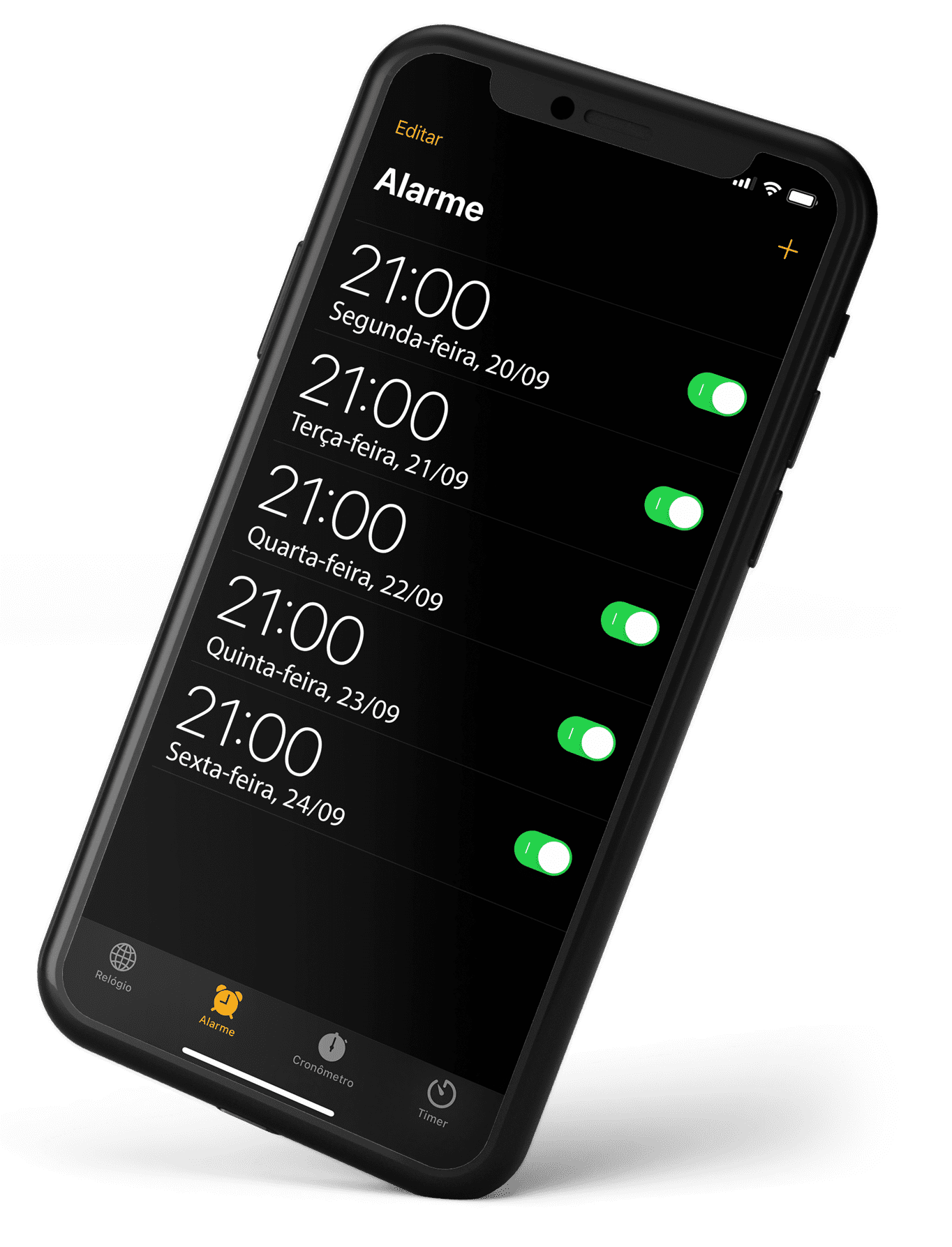 Programe um alarme para os dias 20, 21, 22, 23 e 24, às 21h.